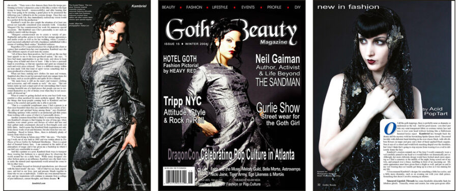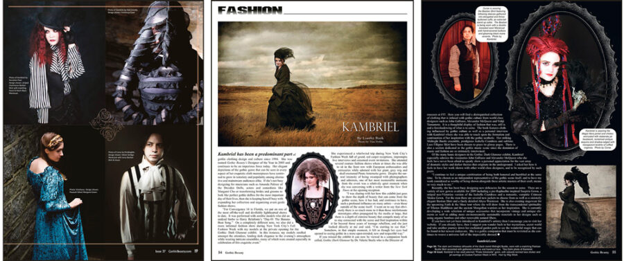 Kambriel‘s importance to gothic fashion and to Gothic Beauty Magazine cannot be overstated. Kambriel was Designer of the Year in the Gothic Beauty Awards. Kambriel (designer, multi-talented human, and design atelier) has been covered many times in Gothic Beauty Magazine, including Gothic Beauty Magazine 11, 15, 18, 25, 27, 28, 37, and probably some more I’m not thinking of right away. She wrote about her Salem home for Gothic Beauty Magazine and occasionally contributed photography. We love her originality, her use of heavy flowing fabrics, and the elegance and couture quality of her designs, and the way she melds historical influences and modern subculture. We love that she “believes in finding magic where it is and creating it where it lacks.” Kambriel has made gorgeous stage looks for musicians from Monica Richards to Information Society. Kambriel has been the go-to for awards show outfits for the darkly-inclined, from Margaret Cho to Neil Gaiman. She creates custom wedding apparel, including for goth models like Jola and for Acid PopTart, one of Gothic Beauty’s most important contributors over the years. She has modeled for Gothic Beauty frequently and dressed so many who appeared in Gothic Beauty’s pages, including Curse, Damion, Batty, Jillian Ann, Lindsay, Wednesday Mourning, Kynt Kaliber, and more. Gothic Beauty has published her collaborations with so many amazing alternative fashion photographers, including Kyle Cassidy, Porcelain Poet, Visioluxus, Dividing Me, Sevila, Curse, Winterwolf, Arielle Smous, Nadya Lev, Rachel Kleinman, and Tina Louise. We are thinking of including one of her photos created with Tina Louise in the retrospective calendar currently funding on Kickstarter. If you pledge the Gothic Beauty Kickstarter project, you can help curate which images we publish. I am very excited about getting to interview such icons of our community. Excerpts of this interview series will be included in the Gothic Beauty 25 Year Reunion of Original Artists – Calendar Project, but I wanted to share the full-length interviews as well.