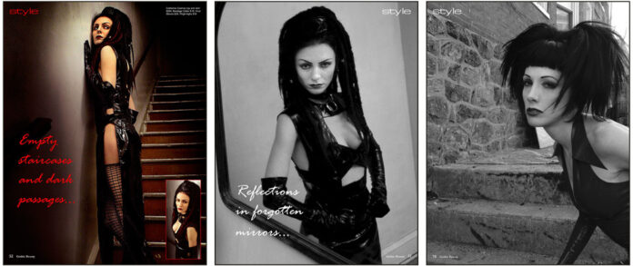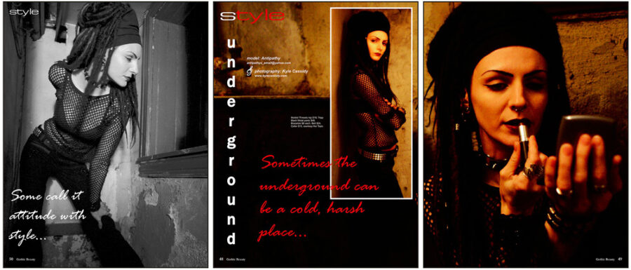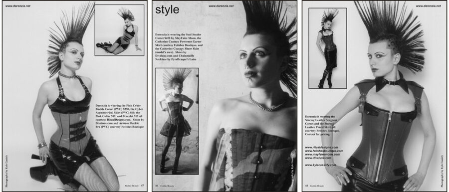 Kyle Cassidy was the first photographer to shoot a Style series for Gothic Beauty Magazine. The magazine did not even have a format for this, but Kyle Cassidy’s work was so interesting that the magazine created a whole section specifically to publish him in. He photographed fashions by MayFaire Moon, Catherine Coatney, DivaLuxe, FyreDraque, Ritual Designs, Stormy Leather, Morbid Threads, Tripp, Renee Masoomian, Nocturnalia, Fashion Crimes, and more, including pulling clothes from early Hot Topic. Models he collaborated with included Feisty Diva, Jennifer “Ayria” Parkin, Nicki Jane, Antipathy, and of course Darenzia.