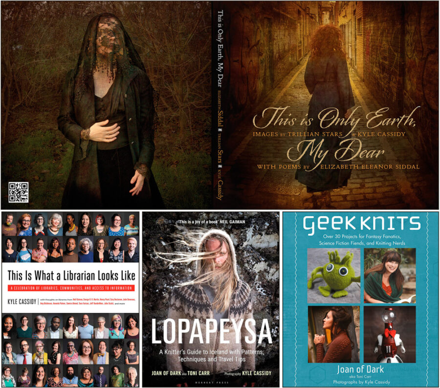 Kyle Cassidy is probably best known for his work which is documentarian but sympathetic to his subjects and he also creates more dark and fantastical imagery. His most recent book, This is Only Earth, My Dear: Images by Trillian Stars and Kyle Cassidy with poems by Elizabeth Siddal, features the more fantastical side of his work and is an “ode to the forgotten Victorian poet Elizabeth Eleanor Siddal.” He and Trillian Stars have also collaborated on two movies she starred in, both based on Ibsen plays. One of his more documentarian books This Is What a Librarian Looks Like: A Celebration of Libraries, Communities, and Access to Information was initially launched on Kickstarter and was re-released this year in a Kindle edition. His work has appeared in over a dozen books, including more whimsical tomes like his collaborations with Joan of Dark Lopapeysa, about viking sweaters, and Geek Knits, which featured geek luminaries modeling knitwear. The latter included U.S. Womens’s Chess Champion Jen Shahade, the guys from Mythbusters, George R. R. Martin, and John Carpenter. Kyle Cassidy has also shot album covers for John Carpenter, Ego Likeness, and Andy Delany from Rubicon.