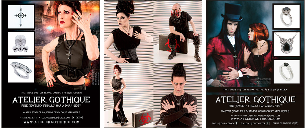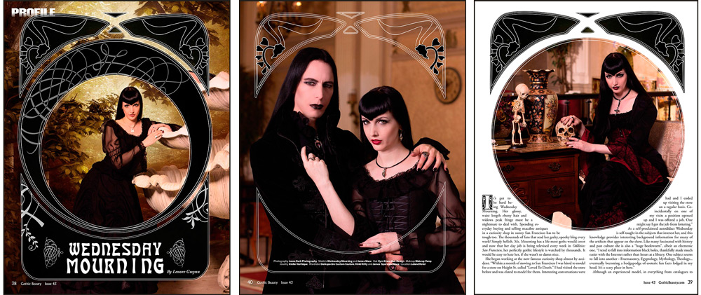 Gothic Beauty Magazine 39, featuring Angela Ryan (“Dark Spectre Custom Couture” and “Atelier Gothique”), was one of my favorite shoots from that period. Both brands defined luxury gothic fashion in their own way. Atelier Gothique specialized in opulent jewelry crafted from unique stones and alloys, while Dark Spectre Custom Couture, based in Florida, created bespoke gothic ball gowns and high haute couture pieces that were truly wearable art.