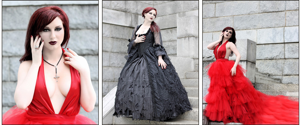 We photographed Angela’s set at Greenlawn Abbey in Columbus, Ohio, a historic mausoleum with incredible marble architecture and ambient natural light filtering through the old estate trees. It was the perfect Gothic cathedral setting. Angela was, as always, a powerhouse in front of the camera. She embodied the regal, dark glamour of those designs effortlessly.