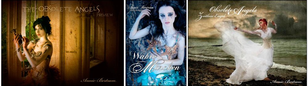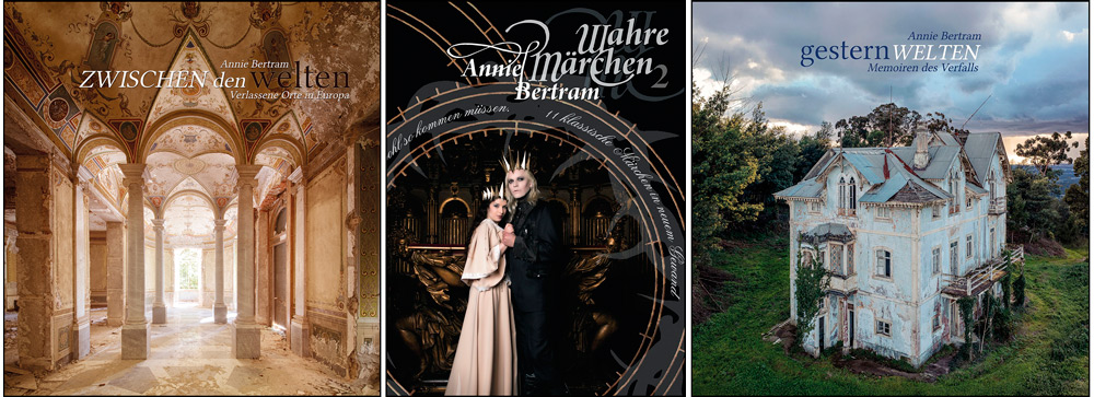 Her photography is deeply rooted in a desire to merge inner psychological states, dreamy narrative fantasy imagery, and gothic alternative subjects, using photography as a bridge between human emotional reality and mythic psychic reality. Annie Bertram’s personal work includes photographing the landscapes of decay, ranging from old buildings to beached seafaring vessels. Her numerous books include her newest Gesternwelten – Memoiren des Verfalls (Worlds of Yesterday – Memoirs of Decay), and Zwischen den Welten – Verlassene Orte in Europa (Between Worlds – Abandoned Places in Europe), Wahre Märchen 2: Elf klassische Märchen in neuem Gewand (True Fairy Tales 2: Eleven classic fairy tales in a new guise), Obsolete Angels – Zeitlose Engel Geschichten aus einer vergessenen Welt (Obsolete Angels – Timeless Angels Stories from a forgotten world), Obsolete Angels Previewbook (Obsolete Angels Preview Book), Wahre Märchen (True fairy tales), and Die Farben der Träume (The colors of dreams).