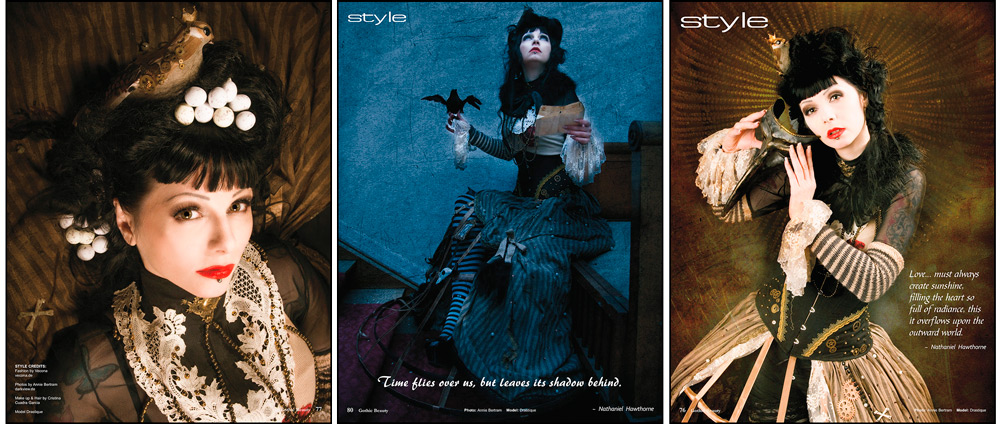 Annie Bertram is Gothic Beauty’s most published photographer. Famous for the dark fairytale emotionality of her images, she contributed importantly to the soft darkly elegant style Gothic Beauty Magazine is known for and has shot seven Gothic Beauty Magazine covers and counting. Annie Bertram contributed to Gothic Beauty Magazine 19, 21, 22, 24, 26, 28, 30, 32, 35, 38, 41, 43, 44, 45, 49, 52, 54, 54, 56, 57, 58, and 59, plus a few more and more on the way. Annie Bertram is a joy to work with and people who work with her tend to work with her multiple times. In addition to her photographs of goth celebrities like Solar Fake, H.R. Giger, and Blutengel, Gothic Beauty has published Annie Bertram’s collaborations with models Drastique, Seraphine Strange, Rose Black, Sabine Kalbermatter, La Esmeralda, Acid Doll, Ulrike Goldmann (Blutengel), Volodina, Laila Bastet, Theresa Fractale, Denise DelConte, Anja Milow, Johanna Constantine, Valentin Winter, Resa, Esther Von Nachtschatten, Sabrina Tippman, Leocadia LaCroix, Angelique, and numerous festival-goers and the occasional concert shot. Some of the designers she has collaborated with for the magazine include Vecona, Royal Black, Romantic Threads, Wulgaria, Vide Noir, House of Inferno, Bibian Blue, Giulia Denise, AMF Korsets, Follow the White, TolllKirsche, Angelique, V-Couture, Arthemis Maskenbilde, Plastikhaar, Malgorzata, Kseniya Arhangelova, and Dr. Brassy Steamington.