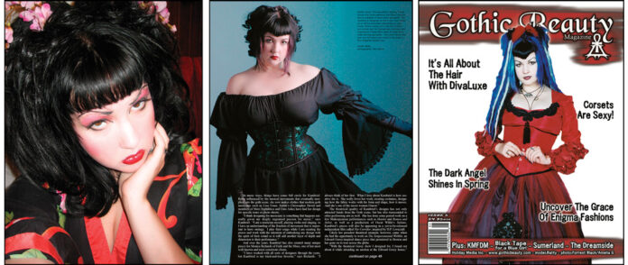 Batty was such a key figure in early 2000s gothic fashion. We regularly featured her Azrael’s Accomplice Designs clothing line, and its offshoot AZAC Couture, in Gothic Beauty Magazine. She and/or her clothing designs appeared in Gothic Beauty Magazine 5, 15, 18, 25, 32, and on various best-dressed event attendees and others pictured in additional articles. She combined her fashion education with her clubland roots to create unique looks. She took her inspiration from diverse sources, from J-rock and visual kei magazines to 80’s glam rock and britpop to traditional Chinese noble attire and old west steampunk. Best known for her elegant ball gowns, models Batty dressed included Dana Dark, Apnea, Angela Ryan, Laura McIntyre, Azenett, Belladonna, Wendy, Deven, Brook, Marjaan, and more. Batty also modeled Kambriel and DivaLuxe in the pages of Gothic Beauty Magazine. She and/or her fashion were photographed for Gothic Beauty by Daniel Amezcua, Lithium Picnic, Ron Davis, Fotonoir, Amelia G and Forrest Black.